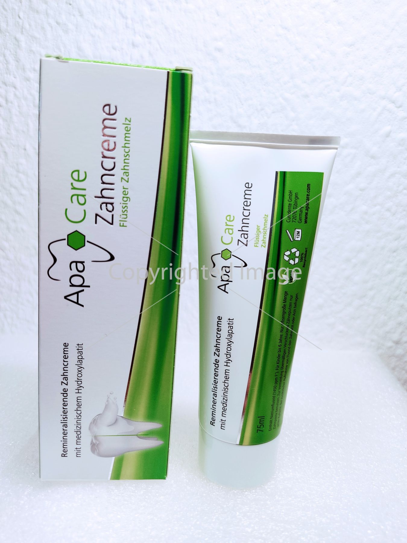 Зміцнююча, ремінералізуюча зубна паста ApaCare містить у своєму складі сполуки фториду натрію та «Рідку емаль гідроксіапатит. Високоактивний мінерал при чищенні зубів покриває їх поверхню, вбудовується в пошкоджені ділянки та створює високоефективний захисний шар, який одночасно ремінералізує емаль та захищає від впливу бактерій, що викликають карієс та різні захворювання зубів. Медичний гідроксіапатит, відновлює пошкоджену зубну емаль, заспокоює зуби, чутливі до болю та холоду. Догляд за ротовою порожниною з зубною пастою Apa Care особливо підійде людям з високою схильністю до карієсу, чутливими зубами, а також після прийому кислотовмісної їжі. ApaCare підходить для будь-якого віку.