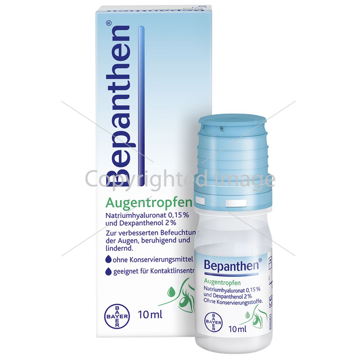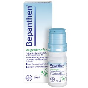 з гіалуроновою кислотою та декспантенолом для зволожуючого і роздражнюючого і уражуючого й охолоджувального і уражувального й охолоджуючого. Очні краплі Bepanthen допомагають при сухості, почервонінні, свербежі або печінні в очах: ??вони замінюють або стабілізують слізну плівку та м'яко, але ефективно захищають від відчуття сухості в очах. Очні краплі Бепантен містять дві зволожуючі речовини - гіалуронову кислоту та перевірений часом декспантенол, який додатково зволожує та заспокоює подразнені очі. Симптоми ефективно полегшуються за рахунок зволоження, освіження та догляду. Очні краплі Бепантен доступні у вигляді зручних багатодозових флаконів та практичних одноразових контейнерів. Вони не містять консервантів, а також підходять для використання з м'якими або жорсткими контактними лінзами.