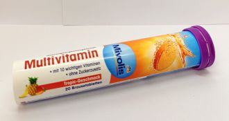 Міволіс Mivolis Multivitamin шипучі таблетки - мультивітаміни зі смаком тропічних фруктів - це харчова добавка, яка забезпечує ваш організм цінними вітамінами і сприяє нормальному функціонуванню імунної системи, а також захисту клітин. Харчова добавка має освіжаючий тропічний смак і підходить для незбалансованої дієти, коли організм не отримує достатньої кількості поживних речовин, або для важких фізичних навантажень. Спосіб застосування: Розчиніть одну шипучу таблетку в склянці води (200 мл). Добова норма споживання має перевищуватися. Дієтичні добавки не слід використовувати в якості заміни різноманітного і збалансованого харчування або здорового способу життя. підсолоджувачі цикламат натрію та сахарин натрію, DL-альфа-токоферилацетат (вітамін Е), нікотинамід, кальцію D-пантотенат, піридоксину гідрохлорид (вітамін В6), барвник рибофлавін, рибофлавін (вітамін В2), тіаміну мононітрат (вітамін В1), фотерилові D-біотин, ціанокобаламін (вітамін В12).