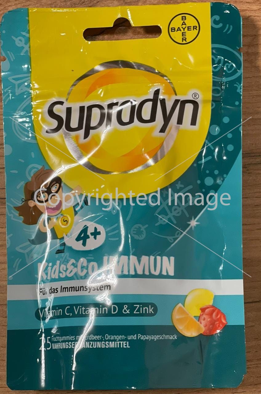 Supradyn Kids & Co Immun містить спеціальну комбінацію мікроелементів для підтримки імунної системи. Вітаміну С, вітаміну D та цинку відіграє важливу роль у виробництві та активації імунних клітин та оптимально доповнює один одного. Особливо важливо допомагати взимку, оскільки холодна погода може знизити рівень вітаміну С, а вироблення вітаміну D знижується через нестачу сонячного світла.